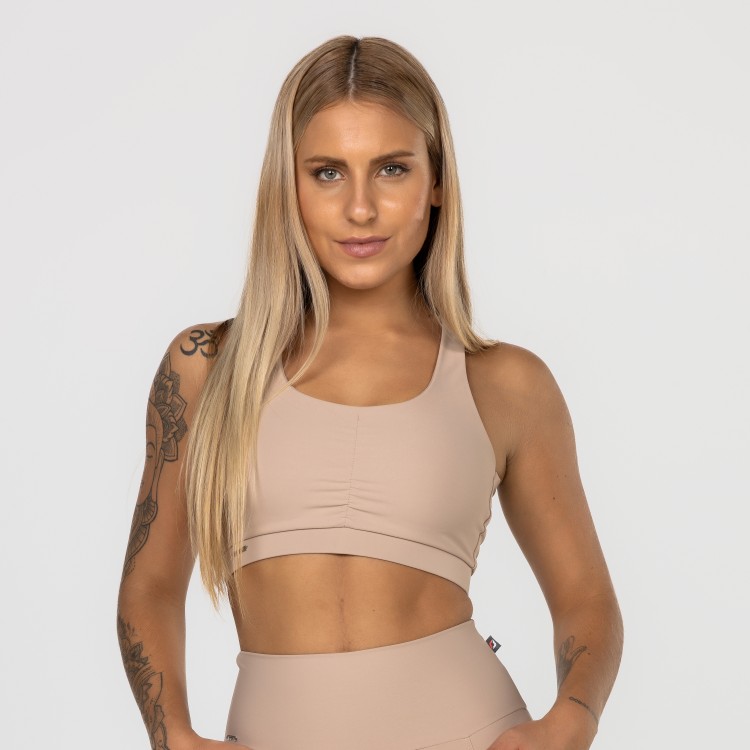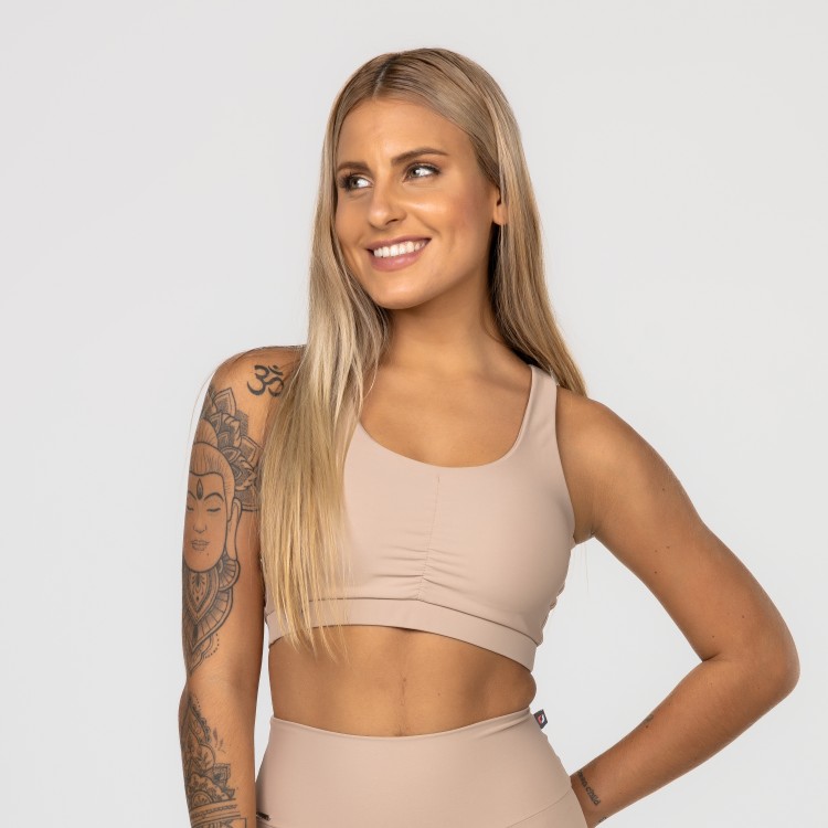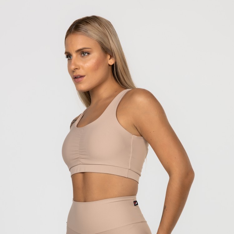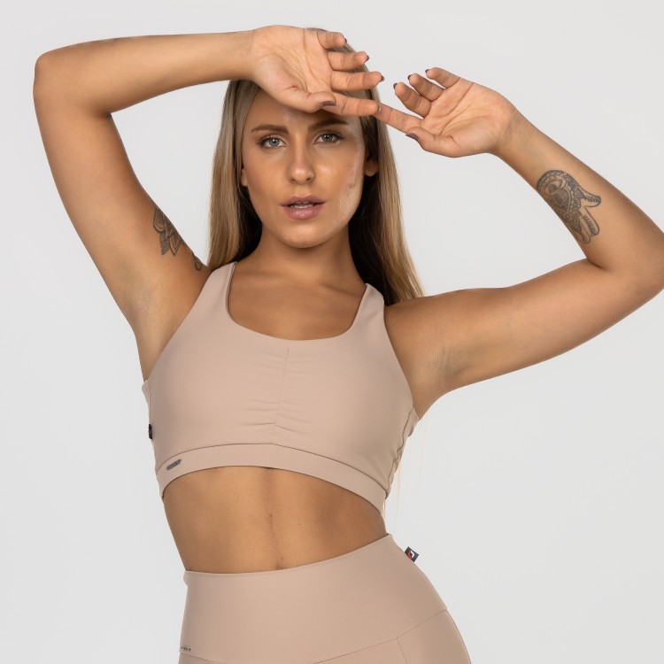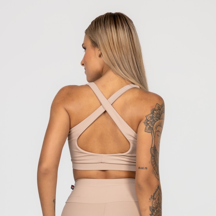Detalhe das costas cruzadas, com elástico no cós, na medida certa para dar firmeza sem incomodar, permitindo praticar exercícios de alto impacto sem qualquer problema de sustentabilidade.