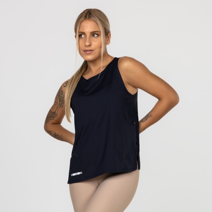 Camiseta de alças largas com decote nas costas e detalhe de tiras, modelagem de altura mediana e corte mais soltinho no corpo.