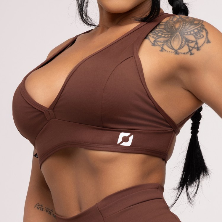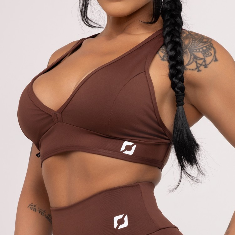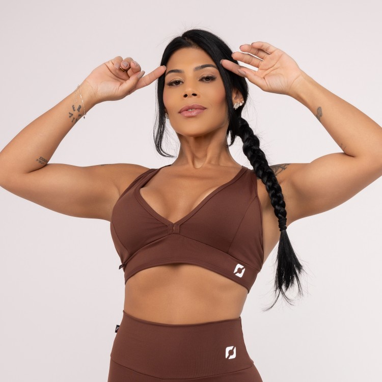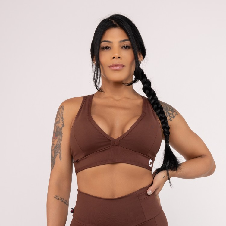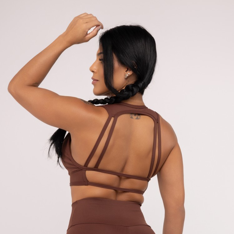Top fitness com decote frontal em V, costas nuas com detalhe em tiras retas e bojo removível, pode ser usado com ou sem o bojo.