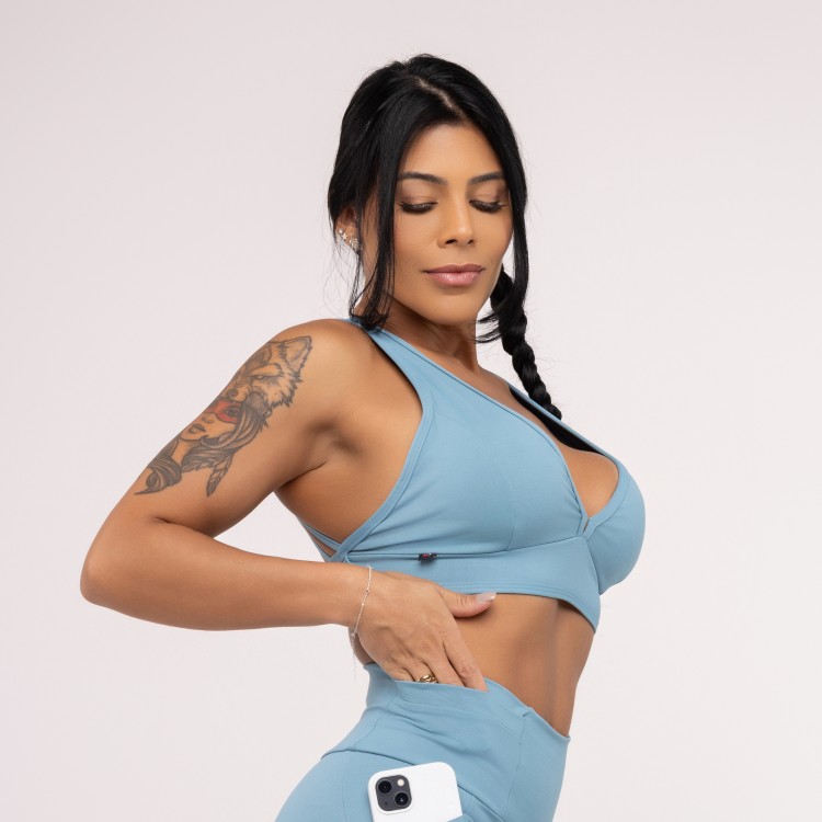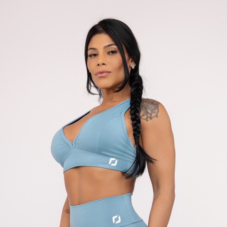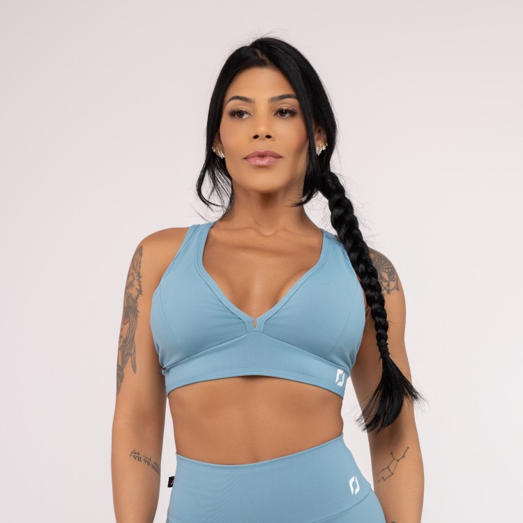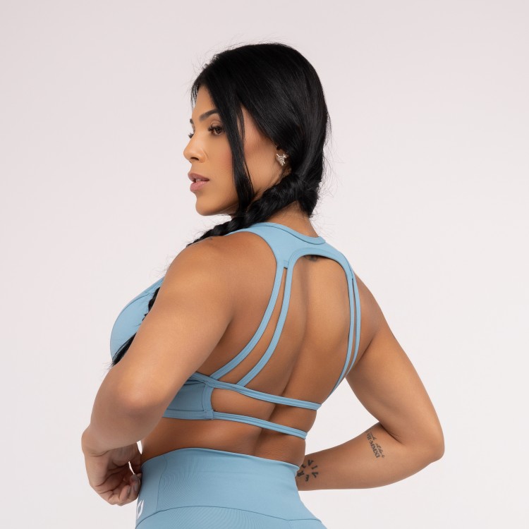 Top fitness com decote frontal em V, costas nuas com detalhe em tiras retas e bojo removível, pode ser usado com ou sem o bojo.